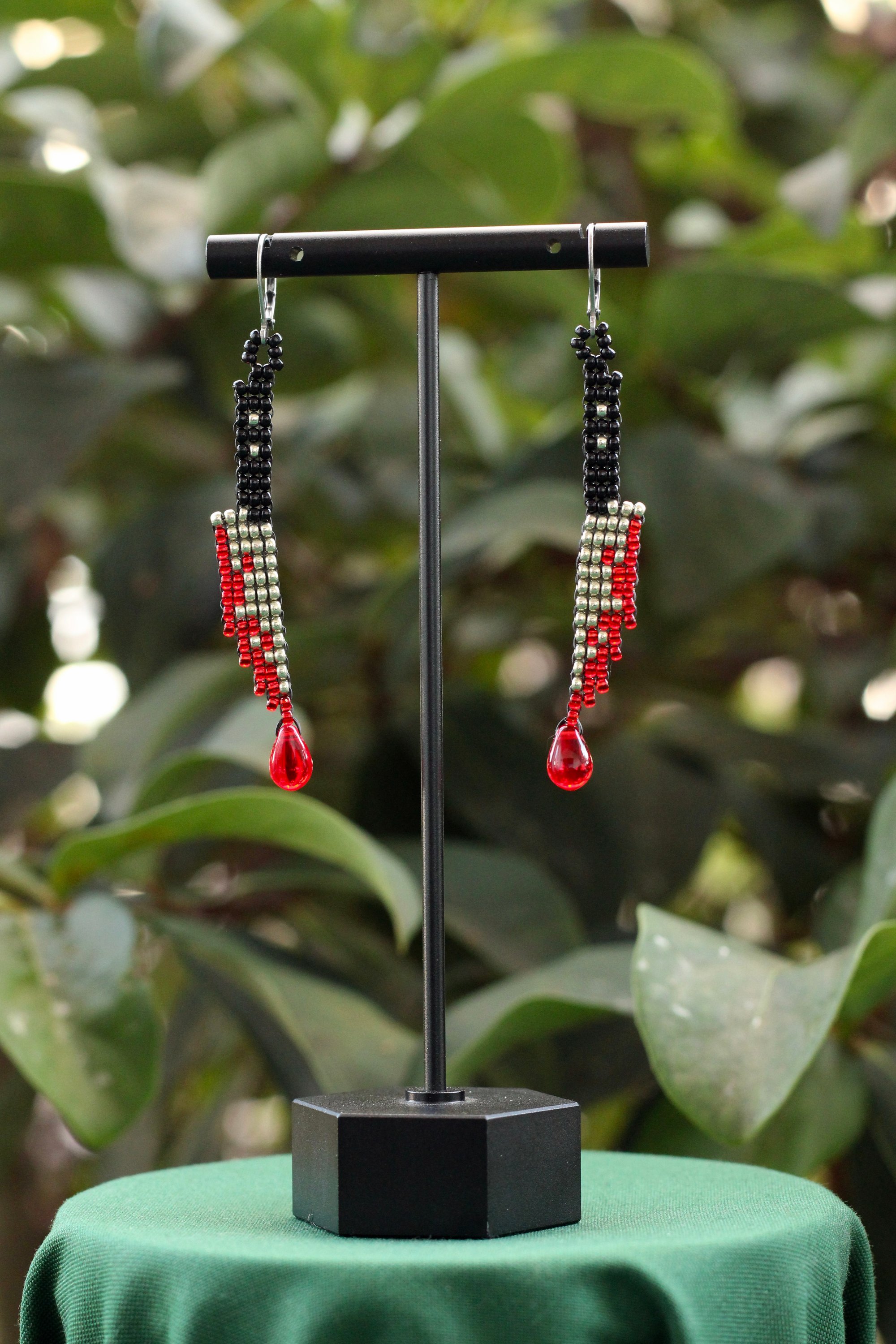 Bloody Knife earrings made with Miyuki seed beads, glass drop beads, and stainless steel earring hooks.