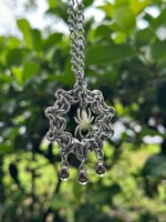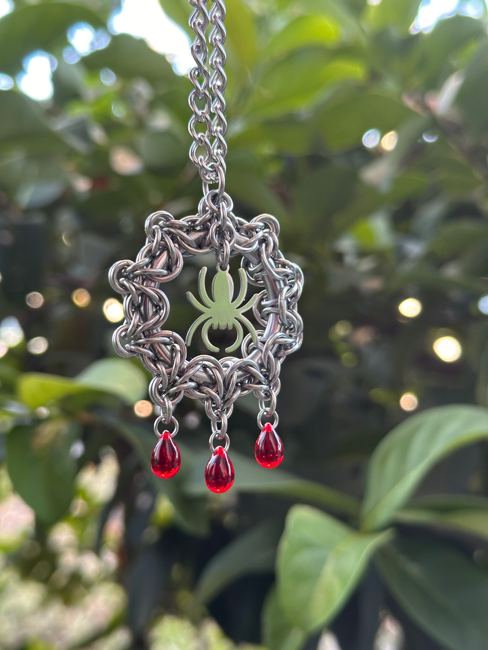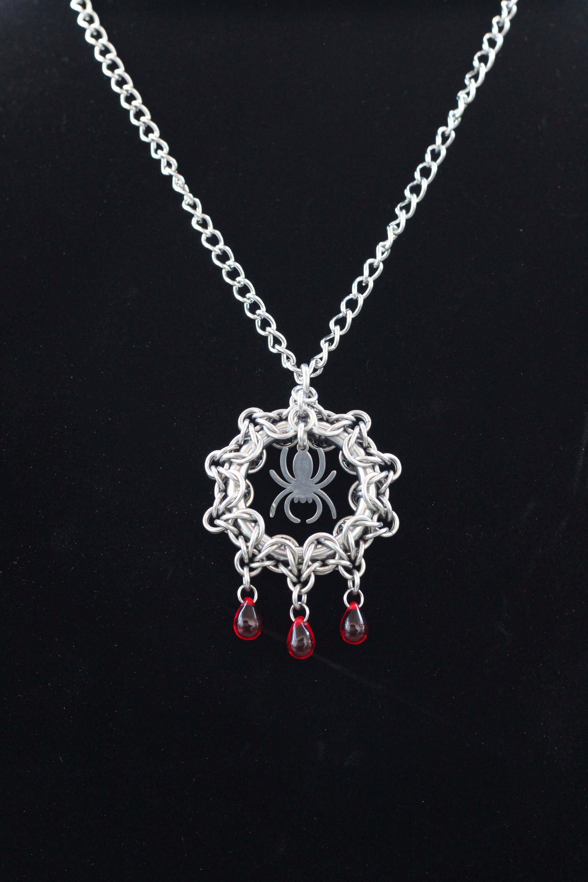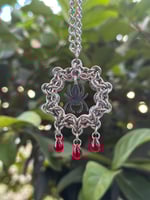 Handmade chainmail necklace using stainless steel and glass drop beads.