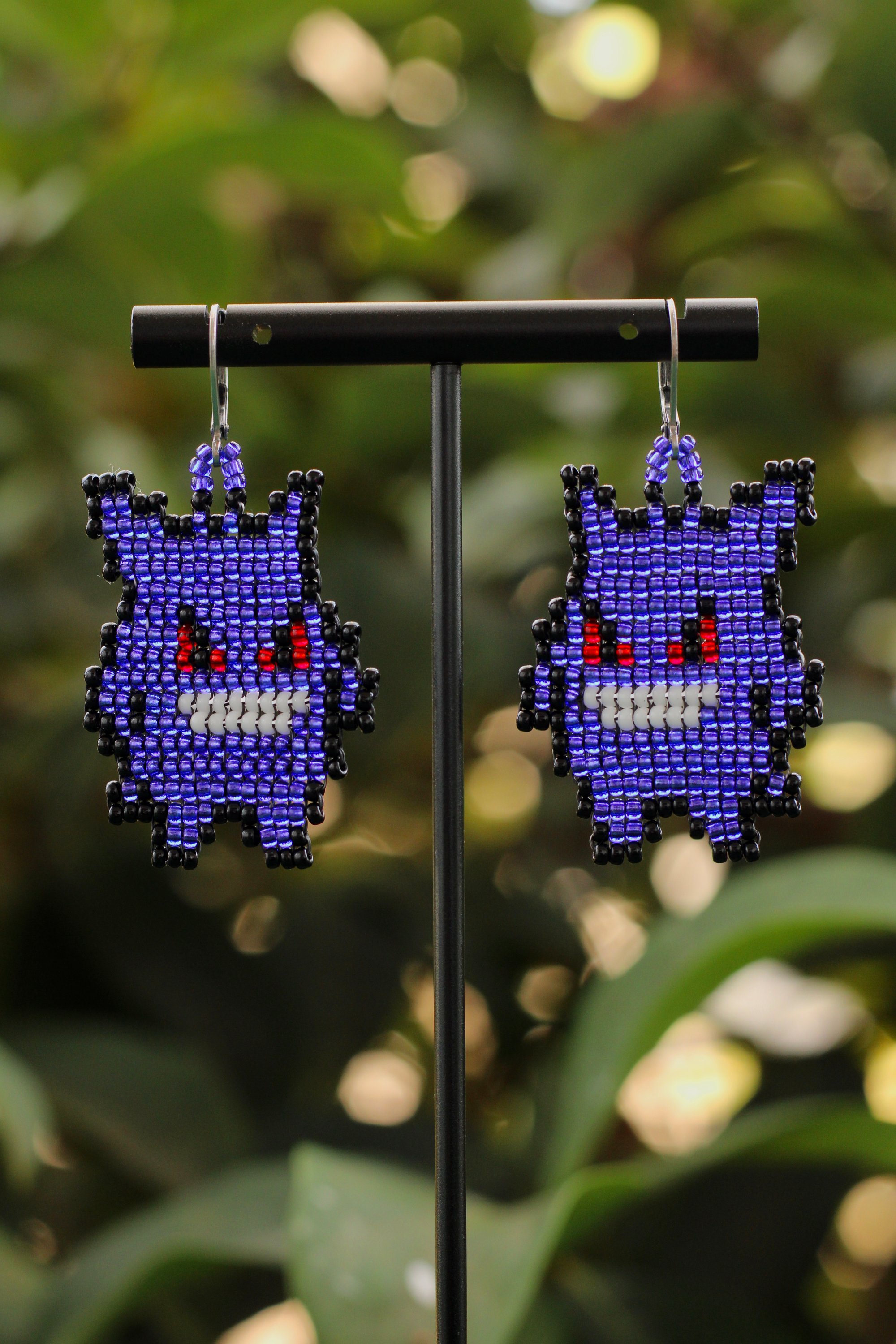 Gengar Pokémon earrings made with miyuki seed beads and stainless steel earring hooks.